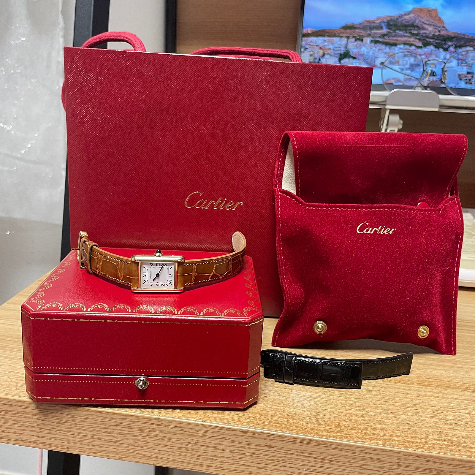 일단 구성품은 이렇습니다. 시계본체와 악어가죽줄 두개 이며 가죽둘 두개는 완전 새것입니다. 제작하고 아예 사용을 안했어요. 작년 5월 말에 오버홀 하고 시곗줄 제작하고 바로 해외를 일년 정도 다녀오느라 귀중품들은 다 한국에 두고 와서 아예 아내도 착용할 수가 없었습니다.