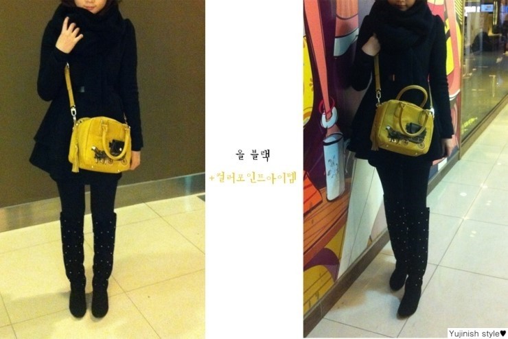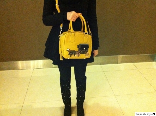 올 블랙에 지난 번에 겟한 머스타드 컬러의 라빠레뜨 CARRIAGE SQUARE SMALL BAG을 함께 코디하기로 결정했답니다.
