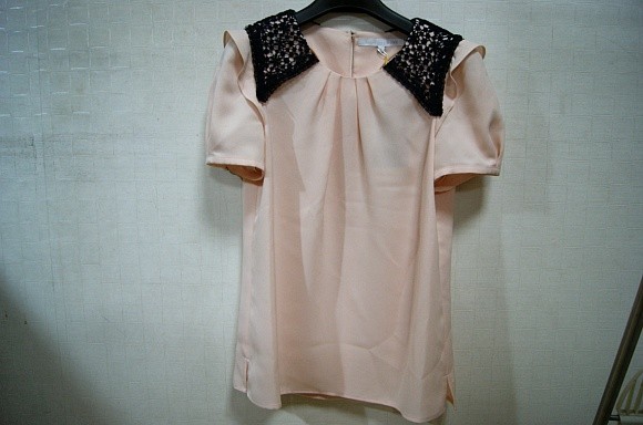 색상은 베이지 칼라에 약간 핑크빛이 감돌고 이으며, 블랙 단색치마나 팬츠에 잘 어울릴 것 같아요>.<