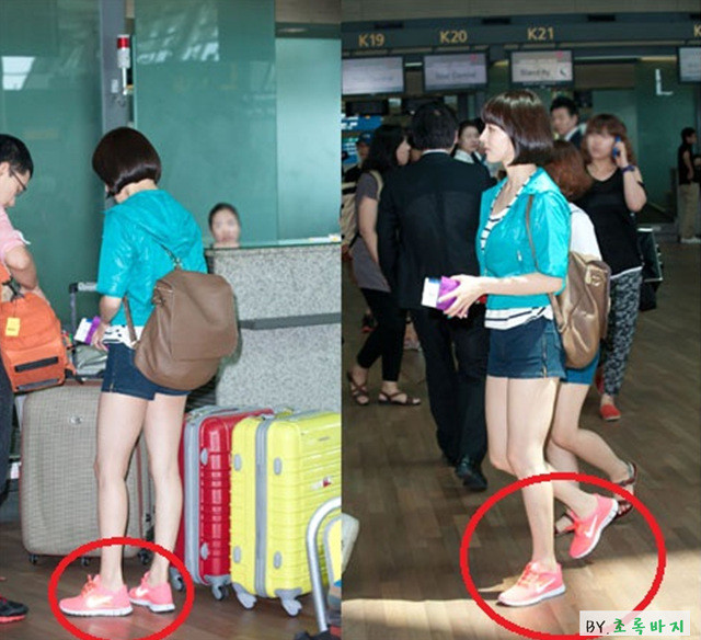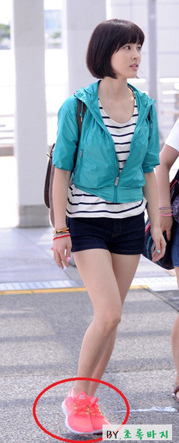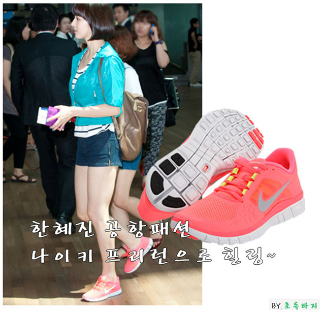 그 중에서도 한혜진 씨는 나이키 프리런+3 형광핑크 제품을 신으셨는데요.