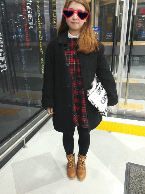 타탄체크 원피스 + 오버사이즈 코트 + 호킨스 워커