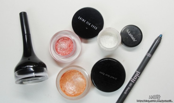 1. 주황색 글리터 섀도우로 눈두덩이 전체를 덮어줘용. 색상은 밝지만 나름 음영+시원해보임을 동시에 주는거예요.