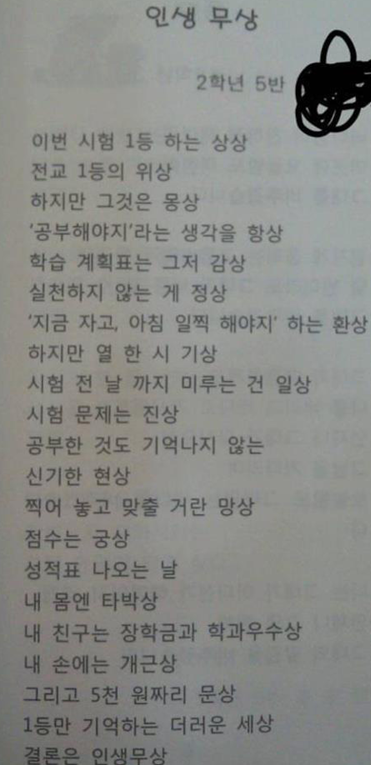 조숙한 중학생이 매우 진지하게 쓴 것으로 추정되는 인생 무상이라는 시