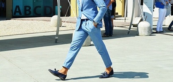 과감한 스카이블루 수트에 네이비 컬러의 로퍼로 안정감을 주는 이런 코디도 굳굳!