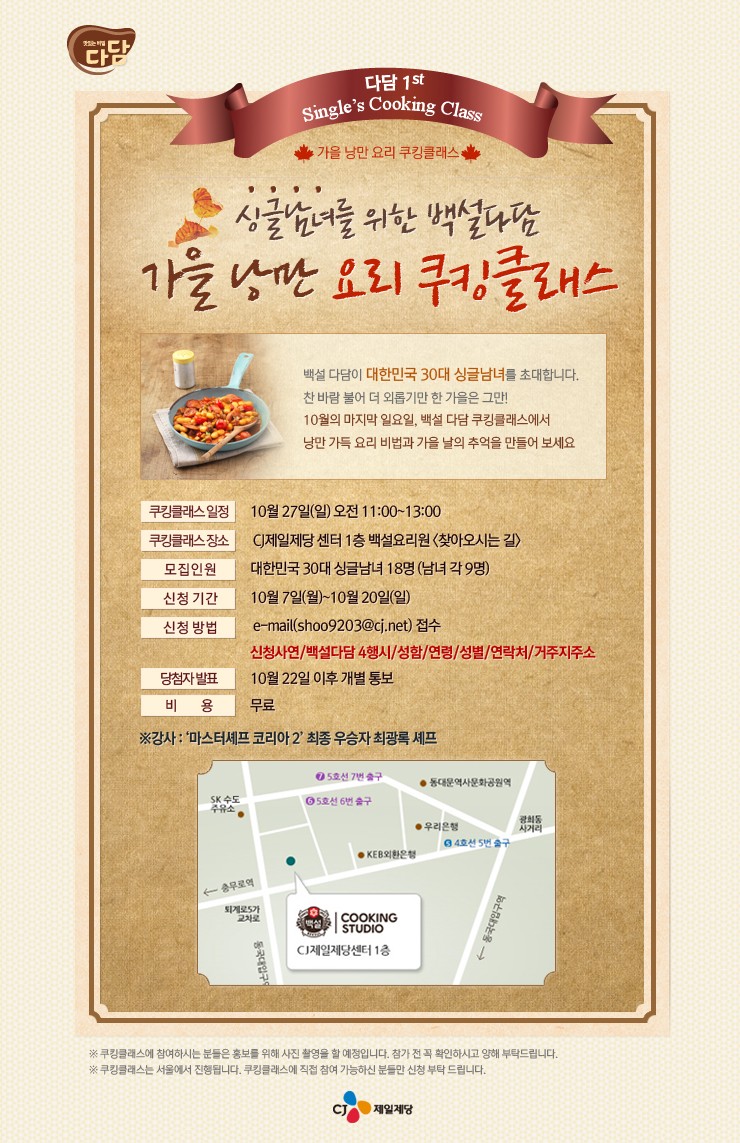 CJ 다담에서 가을을 맞아 오직 30대 싱글들을 위한 쿠킹 클래스를 진행 한대요~