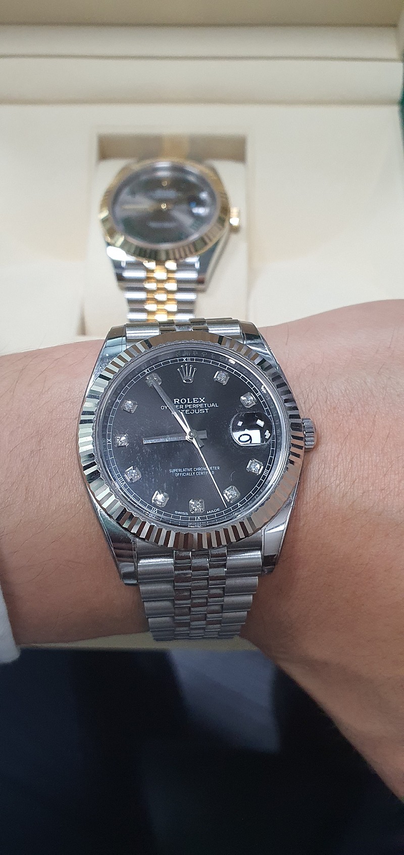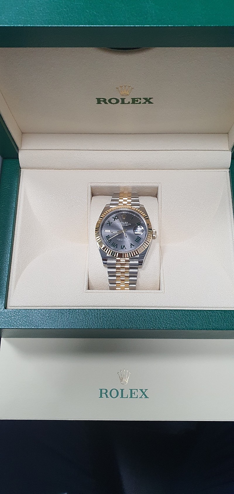 라인붕붕이 님의 도움으로 갑자기 구매하게 된 슬레이트 로만 41미리 엘로골드 콤비 제품입니다.