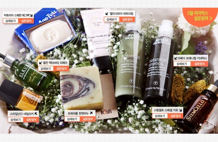 지난 서울패션위크 때 미미박스와 아베다가 함께 한 영상입니다. 한 번 감상해보세요^^ 엘리샤코이라는 브랜드는 들어본 적이 있는데... 비비크림으로 엘리샤코이 제품을 처음 써보겠군요! 미미박스 5월에는 15ml 대용량 샘플이 들어 있네요!!^^ 엘컨이라는 브랜드는 처음 들어보는데요. 정품 용량의 반이 미미박스 5월 구성에 포함되었네요.오오오~ 엘컨 퍼펙트 오거나이징 액티비티 리페어는 재생과 보습에 좋은 제품이라니 트러블 자국으로 스트레스인 저에게 좋을 거 같아요. 스텝셀로 제품은 2ml 씩 여러 개가 랜덤으로 발송되었다고 하네요. 2ml씩 모으니 대용량인걸요? 전 ....Set2 받았어요... 여행갈 때다 운동갈 때 좋겠어요!!^^ 개인적으로 피부가 민감한지라 천연성분의 비누로 2차 세안을 하는데요. 다행히 미미박스 5월에 천연비누 구성이 있군요!ㅎㅎ 프레쉬몰 천연비누 정품은 110g이지만 30g 샘플이 들어 있어요. 미미박스 5월에는 빅토리아 스웨덴 에그팩에 이어서 또 비누가 있는 거네요?ㅎㅎㅎ 수퍼라보를 받았는데, 오버라토였으면 제 피부에 딱 맞았을 것 같아요. 하지만...잘 쓸게요!!^^