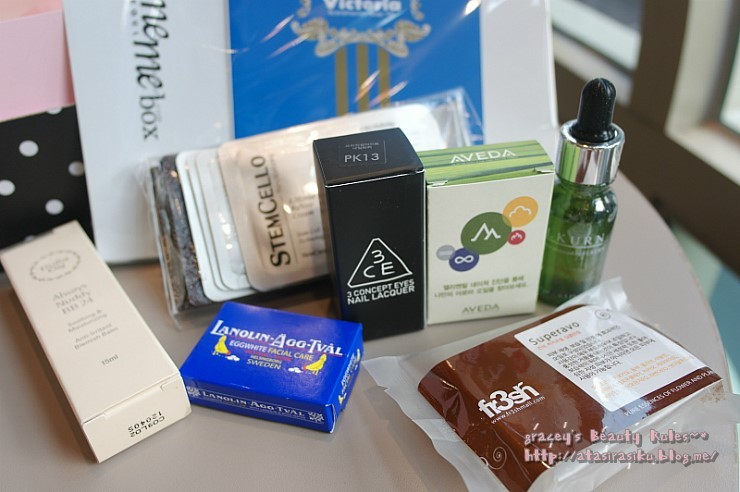 이렇게 7개가 미미박스 5월 구성입니다.^^ 아무리 생각해도 빅토리아 스웨덴 에그팩 대박이에요..ㅋㅋㅋㅋㅋㅋㅋㅋㅋ 이거 쓰고 트러블이 좀 잠잠했었는데...안 쓰니까 또 나는 거 같은 느낌? 다시 열심히 써주어야겠어요!히히 빅토리아 스웨덴 에그팩 정품은 50g인뎅, 미미박스 5월 구성에는 30g이 들어 있습니다. 이 정도면 거의 정품이죠, 뭐..ㅋㅋㅋㅋㅋㅋㅋㅋㅋㅋ 스타일난다 쓰리컨셉아이즈 네일락커 정품이 구성되어 있네요! 제가 좋아하는 핑크색이 들어 있어서 당장 발랐지요..ㅋㅋㅋㅋㅋㅋ 미미박스 5월 대~~박!!ㅋㅋㅋㅋ 전 스타일난다 쓰리컨셉아이즈 서포터즈였기에 쓰리컨셉아이즈 제품에 더욱 애정이 있어요!ㅎㅎㅎ 아베다 스킨케어 제품은 자연주의 제품이라서 자극이 없어 좋을 것 같아요. 헤어제품만 써봤는데, 이번 기회에 스킨케어 제품도 써봐야겠군요!!^^