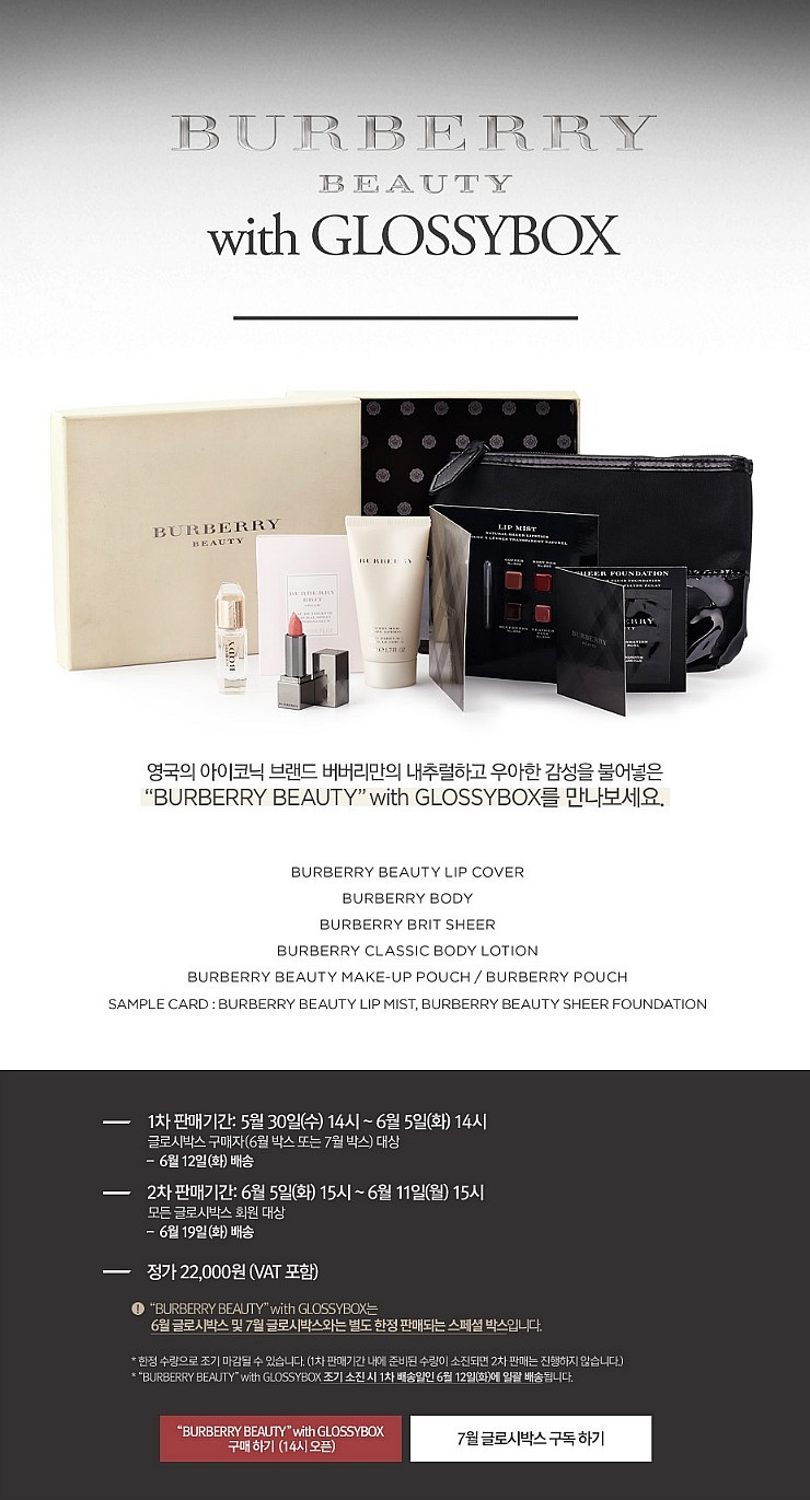 글로시박스 버버리박스 1차 판매기간(6월 5일까지)에는 6월 박스 또는 7월 박스를 구매한 회원분들에 한해서 판매가 되고요.