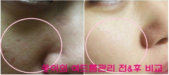 어둡고 칙칙한 붉은자국 여드름 흉터, 붉게 올라오던 여드름외에도 보면 한눈에 봐도 확 얼굴 피부 빛이 좋아졌음을 알 수 있습니다.