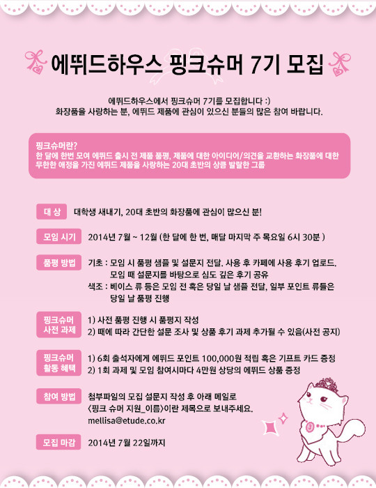 이번에 에뛰드 하우스에서 '핑크슈머 7기'를 모집한다고 해요!